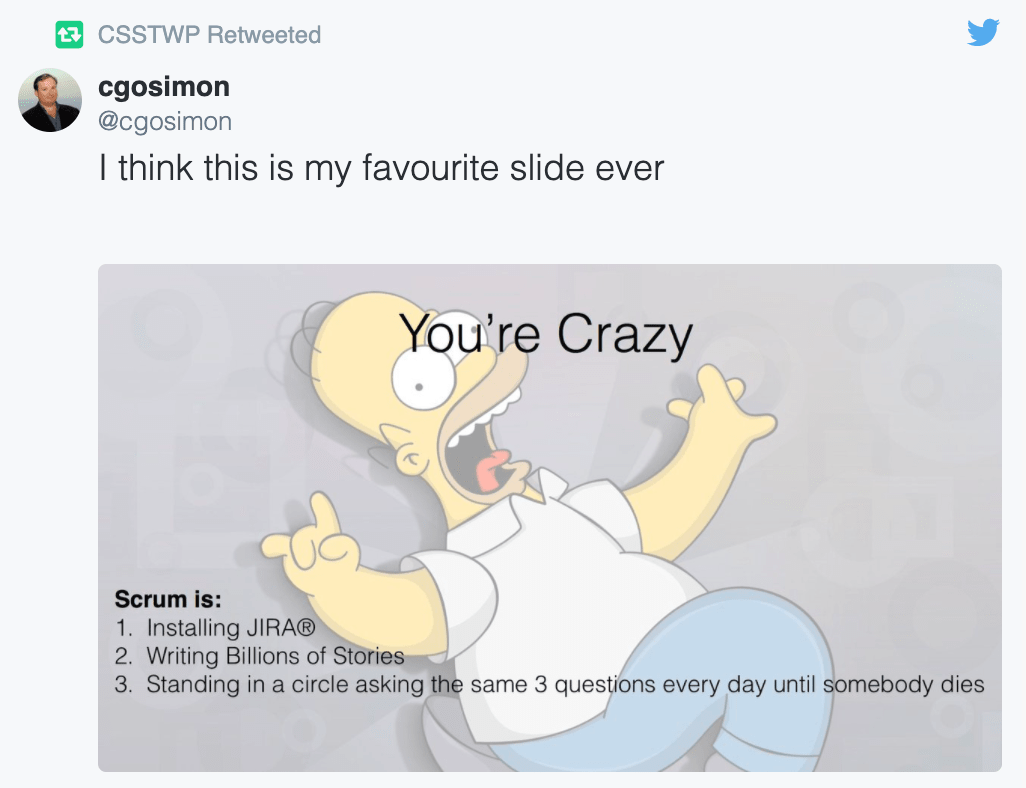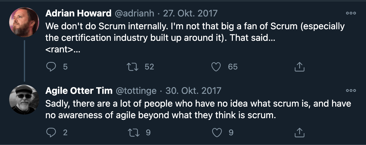 Viele, wenn nicht sogar die meisten Beschwerden die ich über Scrum höre, werden dadurch verursacht, dass Menschen gedankenlos Praktiken aus einer dysfunktionalen Organisation heraus kopieren, in der sie zuerst etwas über Agilität gelernt haben.