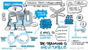 Heidi Helfand gab auf dem Juni Event der agile100 in ihrem Vortrag über „Coaching Teams Through Change“ einen Überblick über verschiedene Thesen der Teamdynamik sowie der Ableitungen auf Erfolg und Misserfolg dieser Wechsel. Vor allem die initiale Teamzusammenstellung wurde von ihr analysiert. So ging es vor allem darum, dass Teams in Unternehmen eine unterschiedlich starke Möglichkeit der Mitbestimmung haben, wer ins Team kommt und wer eben nicht. Durch diese, meist fehlende Mitsprache, kann es zu Unruhe und Zerwürfnissen, vor allem aber zu einem Verlust von Vertrauen (vgl. auch Lencioni’s „5 Dysfunktionen eines Teams“)