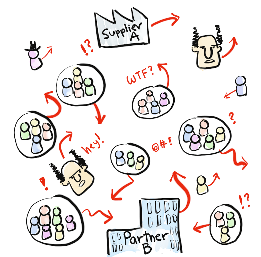 Bei kleineren Vorhaben mit Scrum wird diese Arbeit von den bereits existierenden Rollen und mit Hilfe der Zusammenarbeit mehrerer Teams mit dem Bottom-up-Ansatz erledigt. Bei größeren Unterfangen geht die Abstimmung der vielen Teams jedoch oft schief und manche Dinge gehen zwischen den unterschiedlichen Bereichen in der Organisation einfach unter.