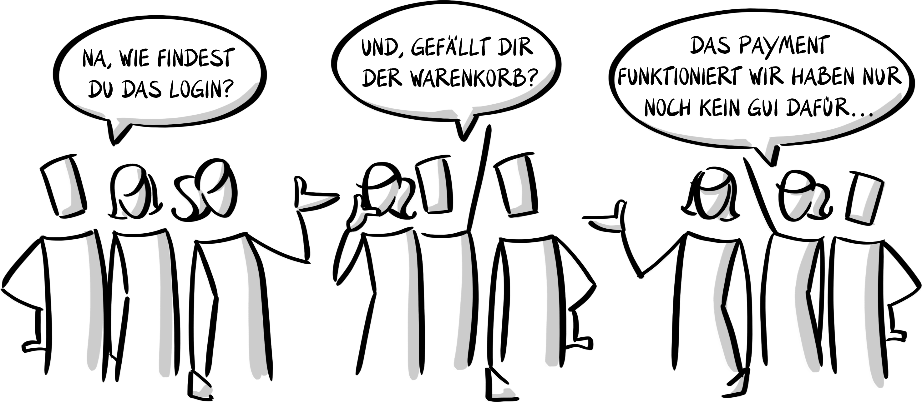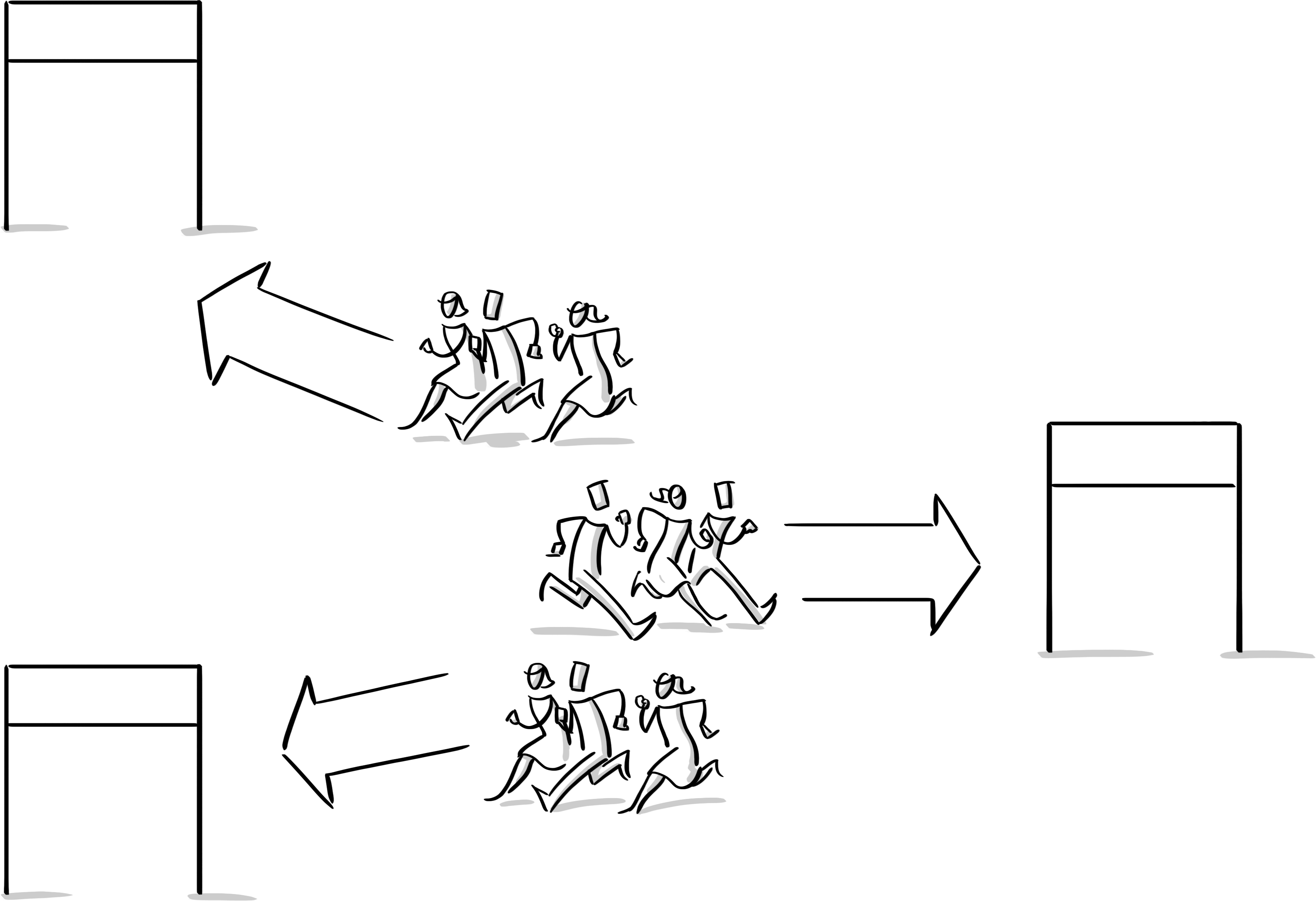 Keiner weiß, was insgesamt wichtig ist – jeder arbeitet in seine Richtung. Statt sich gegenseitig zu ergänzen, optimieren alle die eigene Arbeit und versuchen, die eigenen Ziele zu erreichen. Fehlt dann noch in jedem einzelnen Team der Blick darauf, was insgesamt wichtig ist, so ist auch das Gesamtergebnis oft kein Mehrwert für den Kunden. Ein teamübergreifender Review läuft dann leicht so ab: