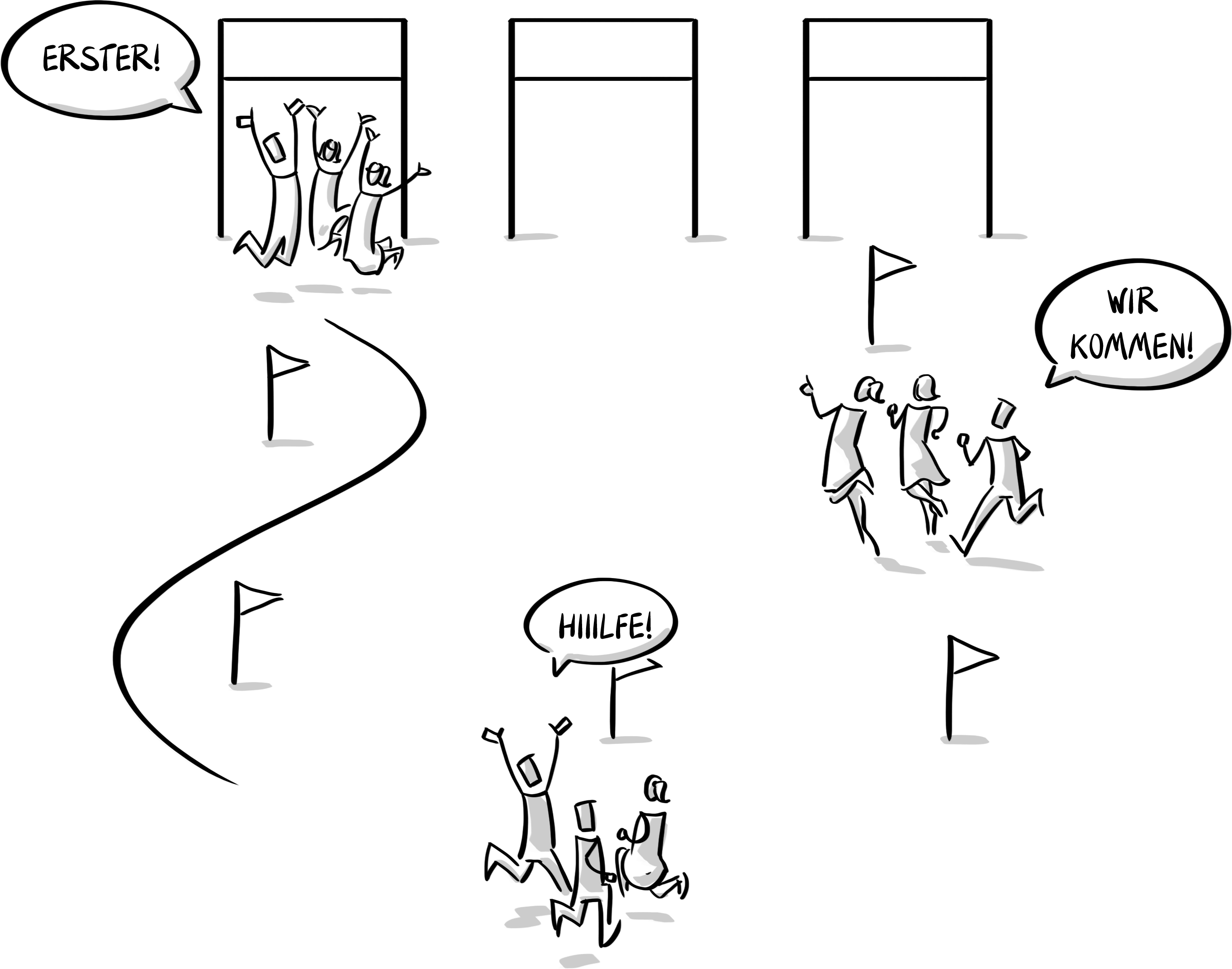 Am Anfang jedes Sprints setzen sich die Teams ihr jeweiliges Iterations-Ziel. Am Ende der Iteration schaut man dann, ob dieses Ziel individuell erreicht wurde, und ob es noch in die gemeinsame Richtung passt. Dabei kann es durchaus sein, dass man mal abgeschweift ist. Das erkennt man aber dank der regelmäßigen System Demo schnell und eindeutig. Man kann sofort im nächsten Iteration Planning gegensteuern.